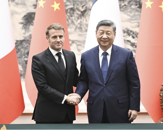 会谈前,习近平和夫人彭丽媛在人民大会堂北大厅为马克龙和夫人布丽吉特举行欢迎仪式。